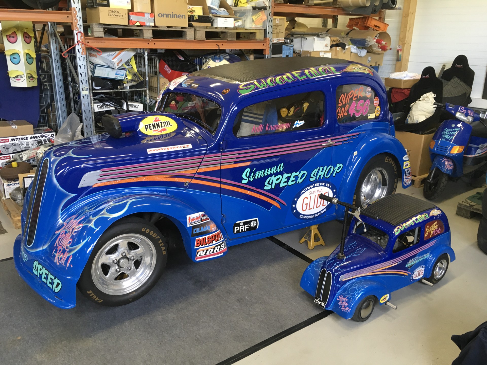 Price for the car, turn key, is 30 000 € without taxes. The small Anglia replica (which runscan be driven up to 60 km/h!) can be included in the deal upon negotiation.